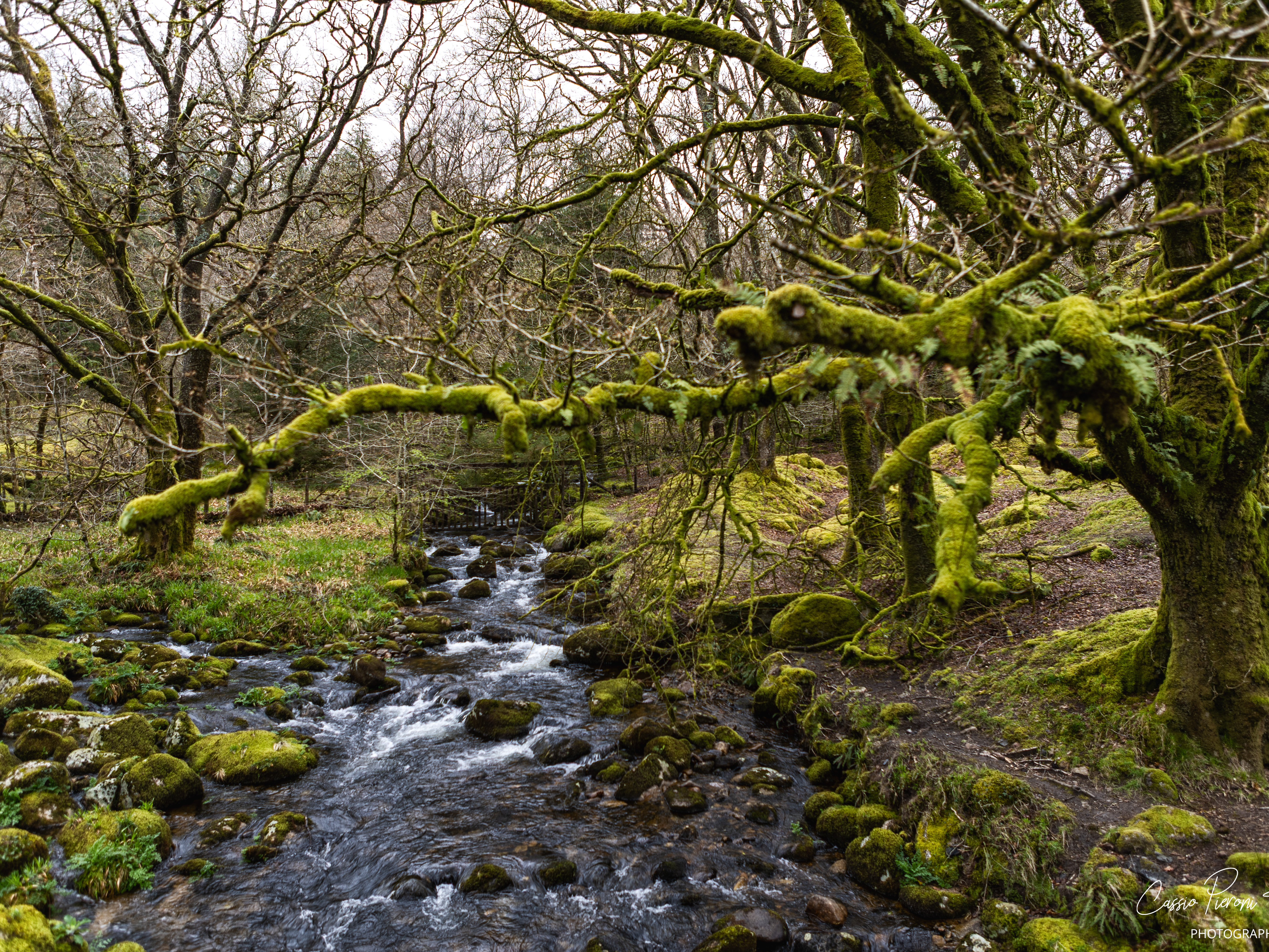 A patchwork of green fields stretches across the Dartmoor landscape under bright skies and drifting clouds.