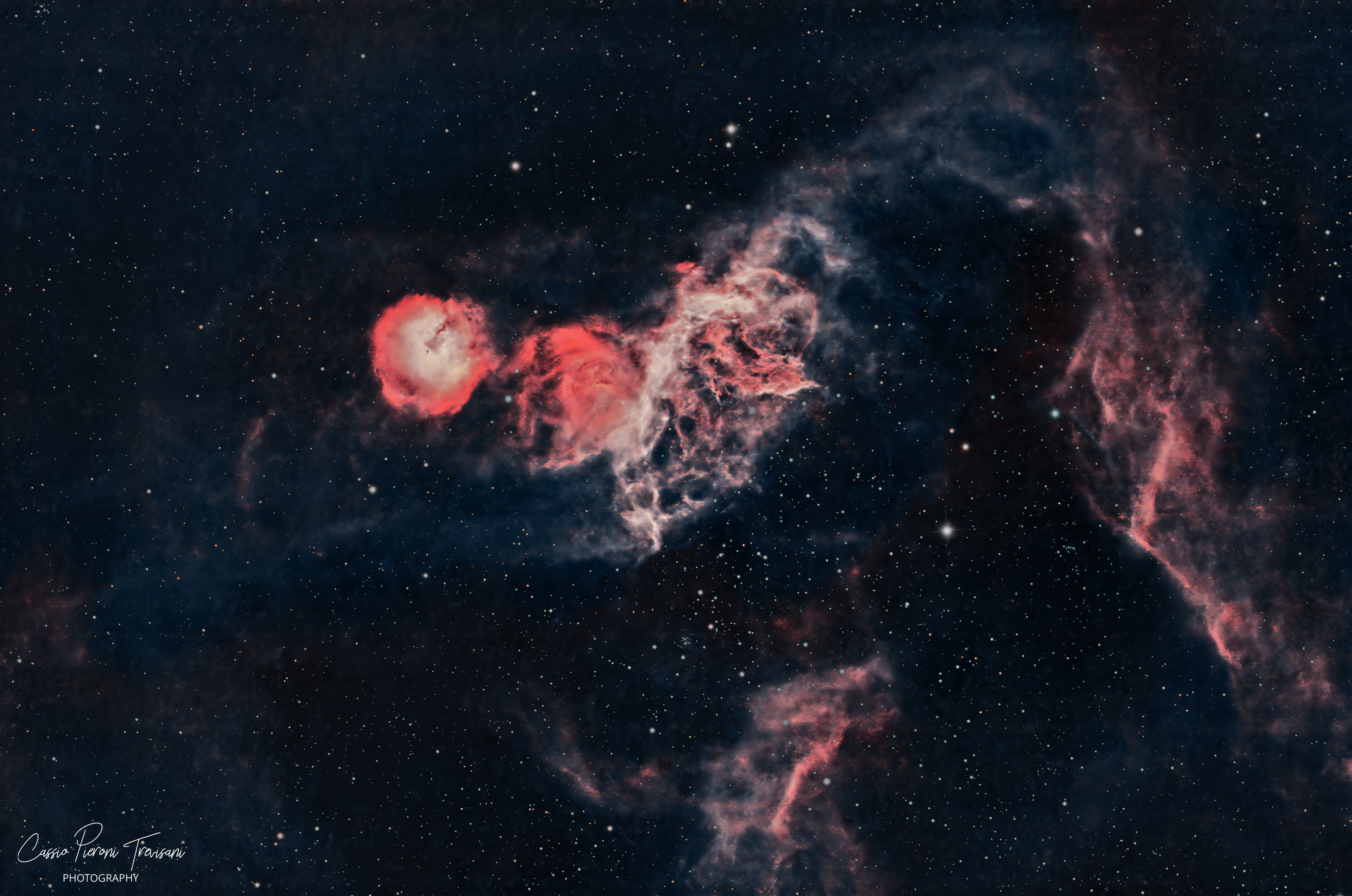 This image captures the faint, intricate structure of KMHK 833, an emission nebula in the Large Magellanic Cloud (LMC). Surrounded by a rich star field, the nebula reveals a complex network of ionised gas shaped by stellar winds and radiation from nearby massive stars. The data were processed using a narrowband HOO palette, mapping hydrogen-alpha to red and oxygen to blue/teal. This combination highlights the contrast between the dense, energetic core regions and the more diffuse outer filaments. The central structure shows intense hydrogen emission, while the surrounding arcs and wisps reveal subtle oxygen-rich regions, giving the nebula its characteristic red and cyan appearance. Special care was taken during processing to preserve fine detail in the filamentary structures while maintaining a natural balance between the nebula and the surrounding star field. Stars were extracted and reintegrated after separate processing to ensure they complement rather than overpower the faint nebulosity. KMHK 833 is not a commonly imaged target, making it a rewarding object to explore. Its delicate structure and location within the LMC offer a glimpse into star formation and feedback processes in a neighbouring galaxy.
