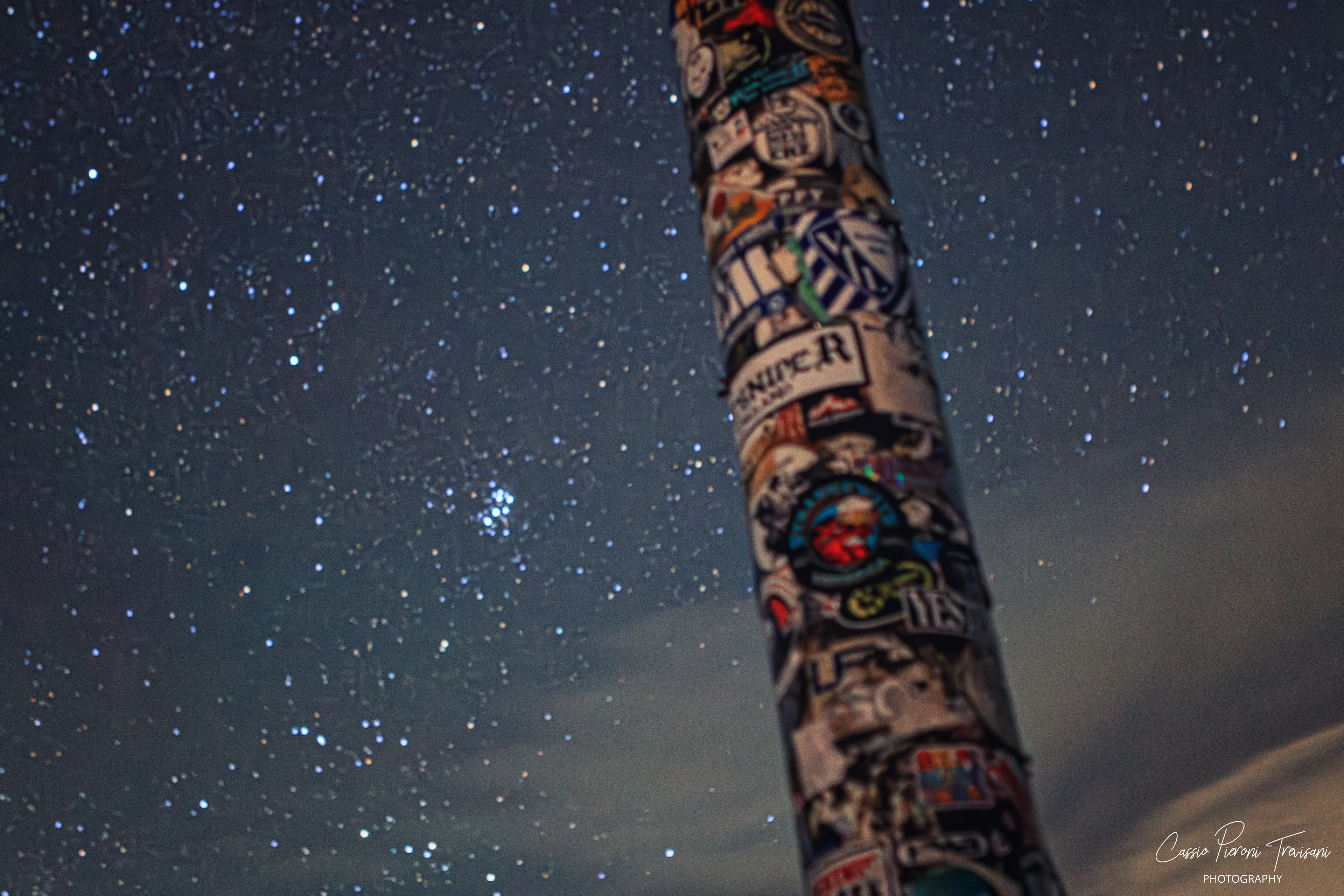 A sticker-covered post rises toward the Milky Way — a modern imprint beneath a sky billions of years old.