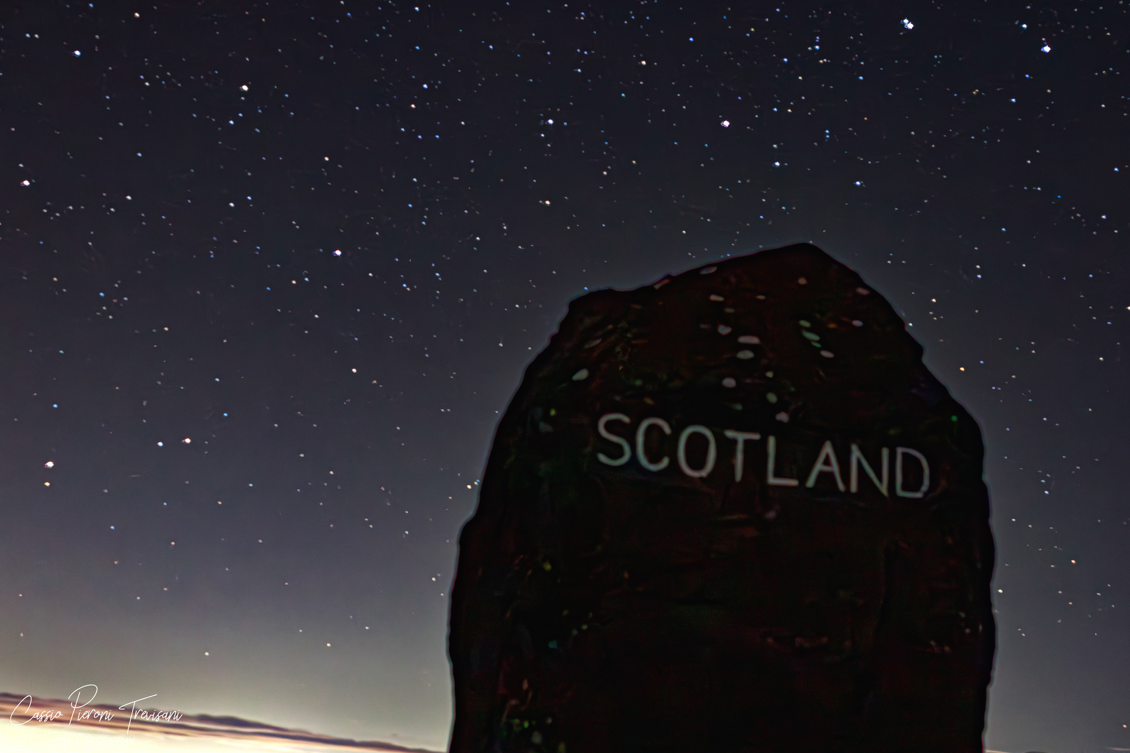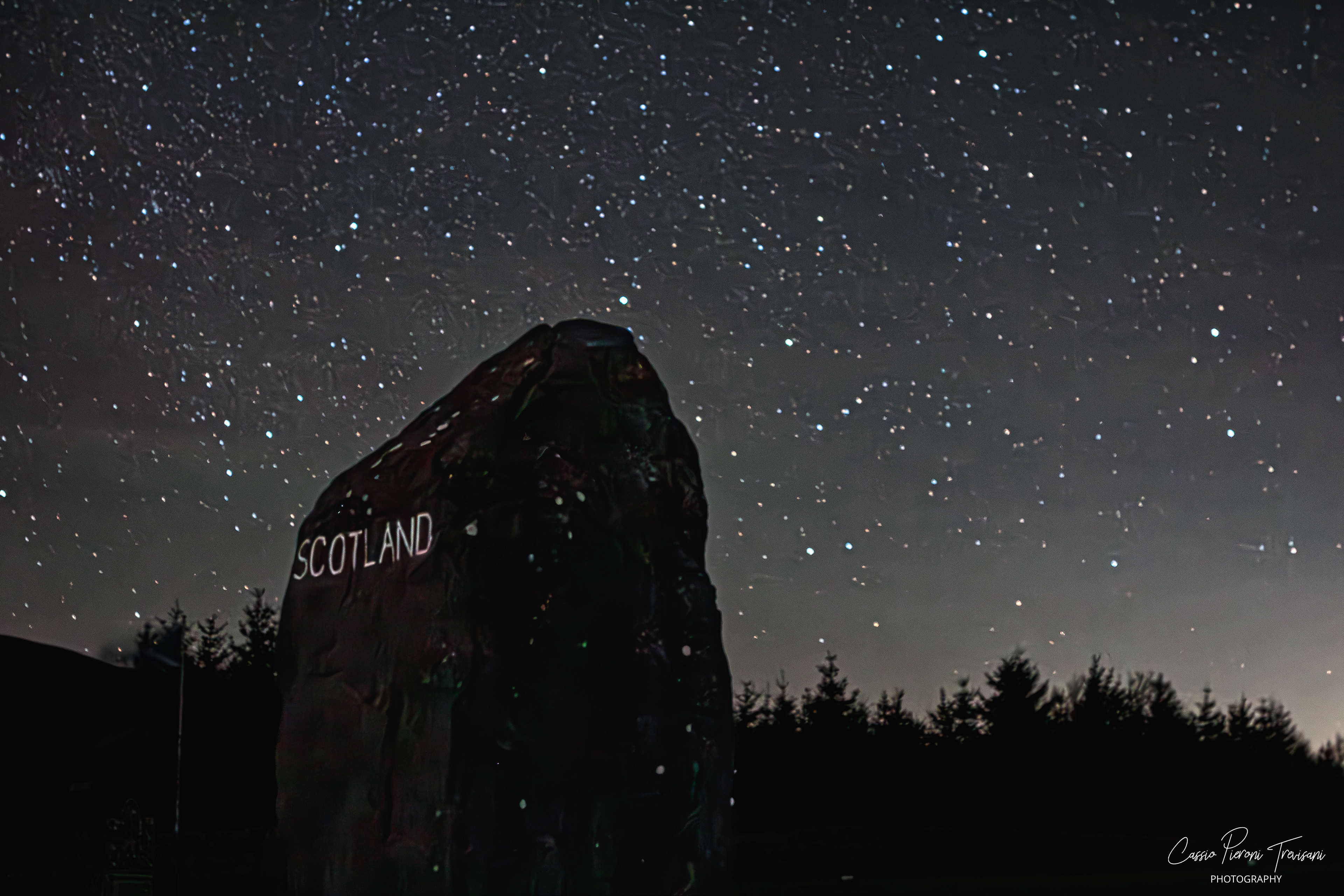 The Scotland border marker stands silhouetted beneath a sky scattered with stars at the edge of Northumberland.